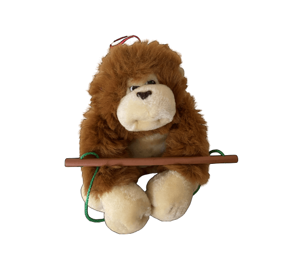 Grote pluche aap met een groen touw en stok in zijn poten.