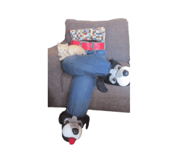 Voor katten/kittens of hondjes die heel graag op schoot liggen, maar waarvan het baasje niet heel de dag voorhanden is biedt deze alternatieve spijkerstof-schoot mét grappige pantoffels uitkomst!