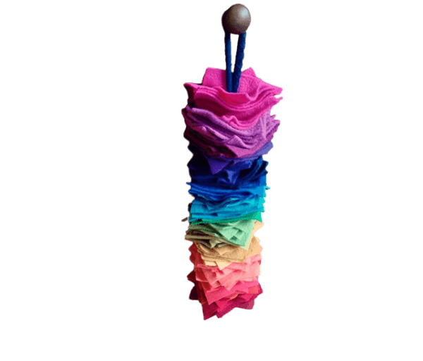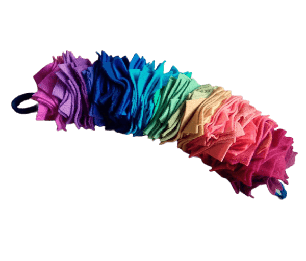 Deze vrolijk gekleurde hele volle en lange snaffel heeft enkelvoudige fleecelapjes in de kleuren van de regenboog, inclusief de kleur roze.