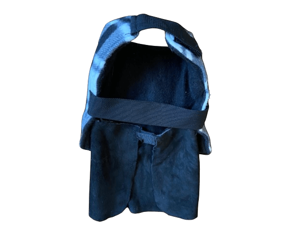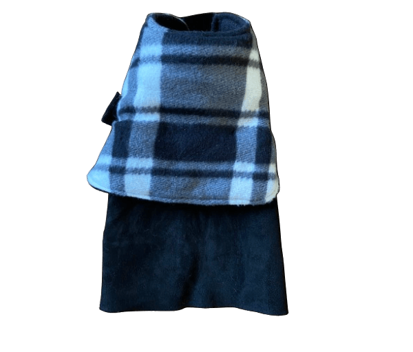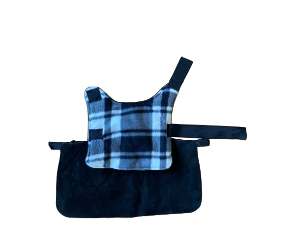 De geruite stof is van gevoerde fleecestof, de zwarte achterflap van suede.
