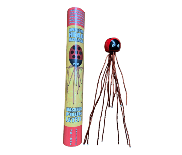 Supergrappige hoofdmassage in de vorm van een houten lieveheersbeestjeslijfje met metalen massagepootjes, die zijn afgewerkt met witte beschermtipjes.