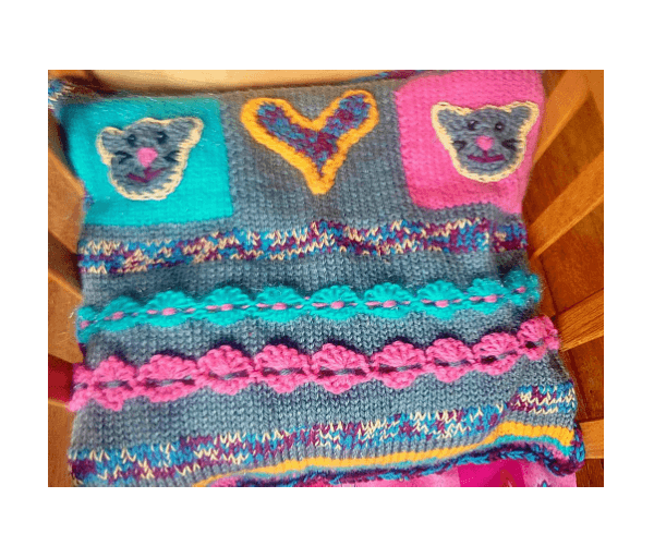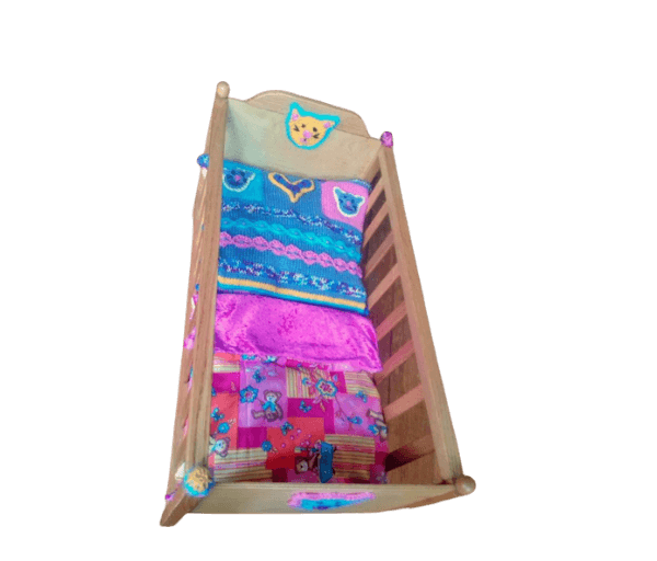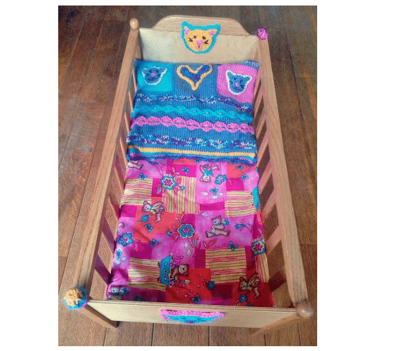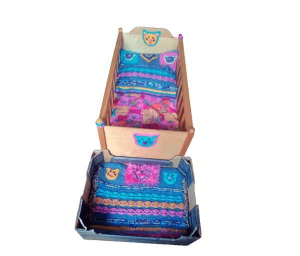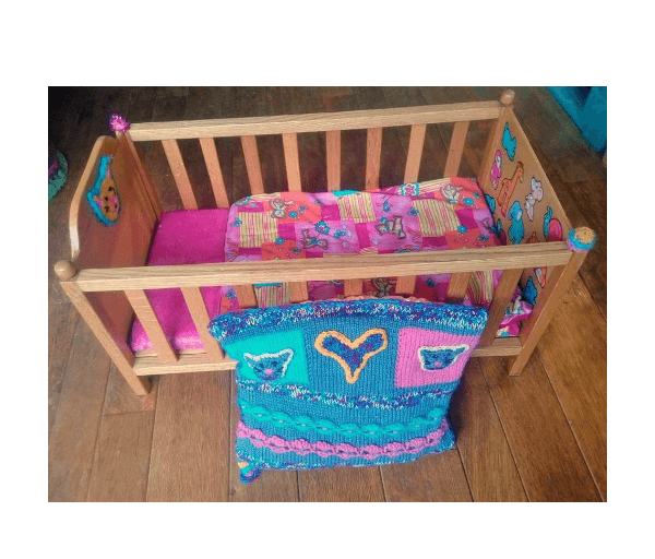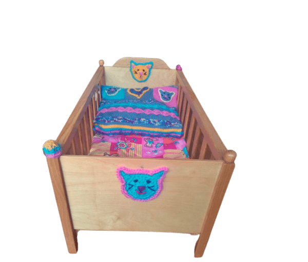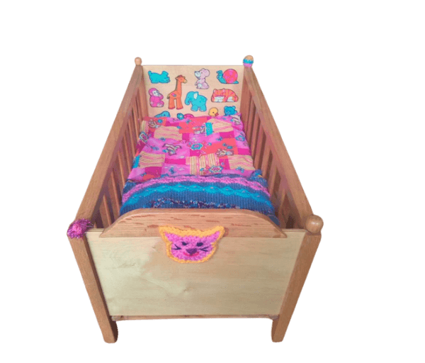 Beeldig houten bedje met aan het voeteneinde allerlei afbeeldingen van gekleurde diertjes en aan de buitenkanten van hoofd- en voeteneinde een gehaakt poezenkopje wat ook weer terugkomt in het gebreide kussentje.