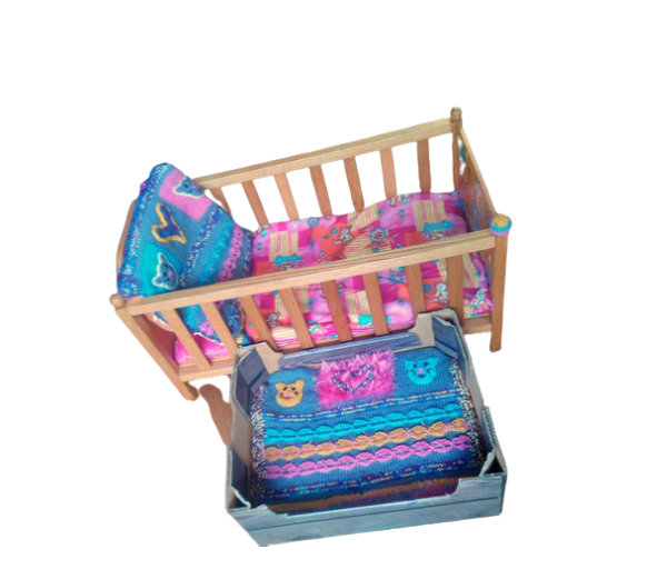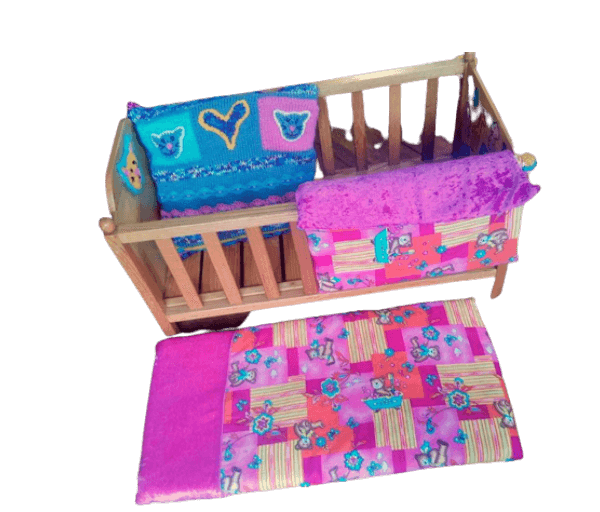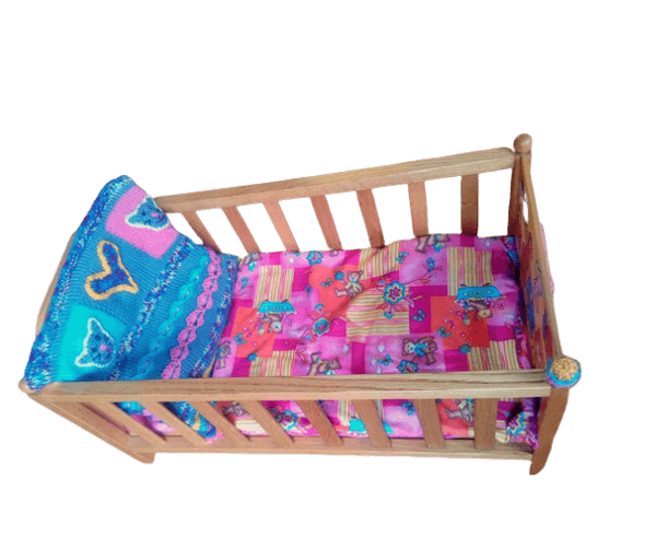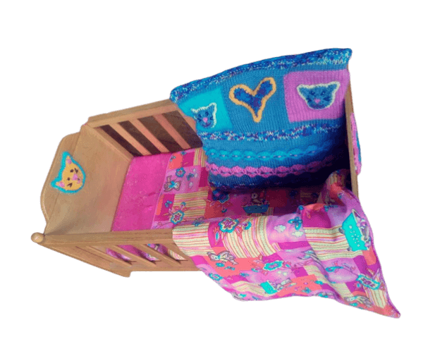 Houten ledikantje roze-blauw-geel met gebreid kussen en berendekentje + matrasje.