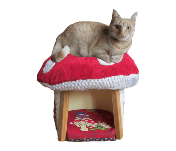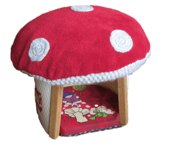 Te lief voor woorden: een heel cute en beeldig kattenhutje (maat M) in de vorm van een paddenstoel (rood met 6 gehaakte witte/ecru stippen) met een bijpassend kussentje (de ene kant met de afbeelding van een paddenstoeltje, kikkertje en sprookjesfiguur; de andere kant groen fluweel.