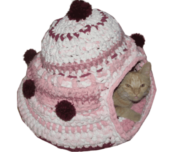 Supermooi  en grappig/schattig gehaakt hutje (maat L) in de vorm van een cup-cake in de kleuren wit, roze en bordeaux.