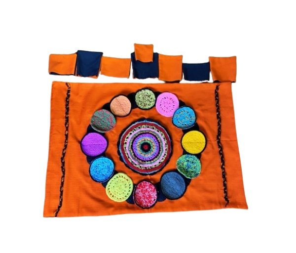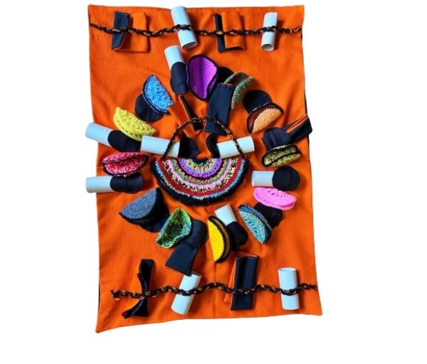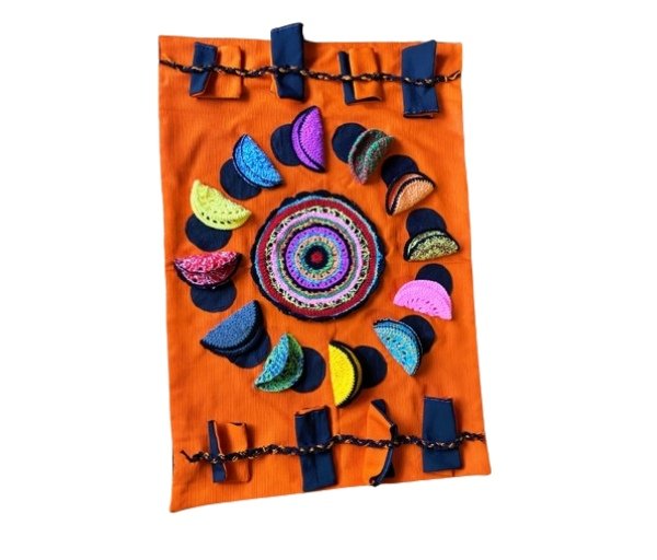 Aan beide zijkanten zijn er 2 gehaakte gekleurde vlechtkoorden en onder de grote cirkel nog een rond vlechtkoord. Zowel in de gekleurde ronde binnenrand als in de 2 zij-vlechtkoorden kunnen (de 8) bijpassende oranje/zwarte zakjes gestopt worden voor extra snuffelplezier (of w.c./keukenrollen, washandjes, reepjes krantenpapier etc.)