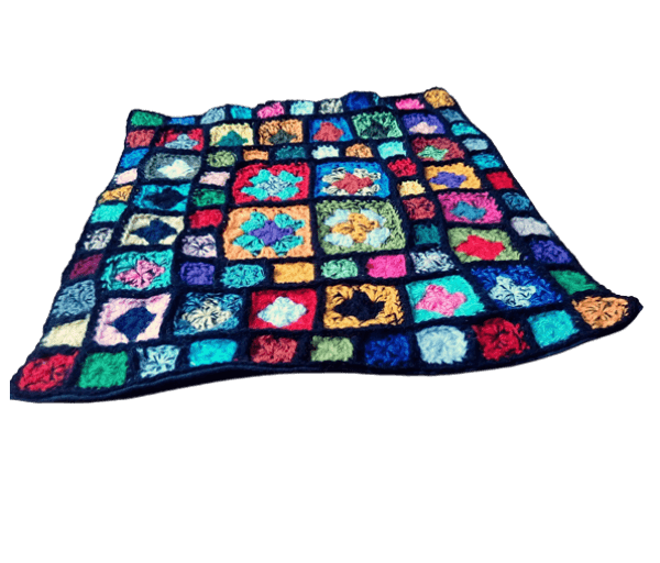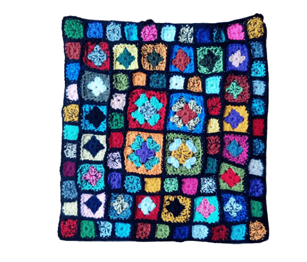 Zeer kleurrijk vrolijk gehaakt kleedje met zwarte randen.