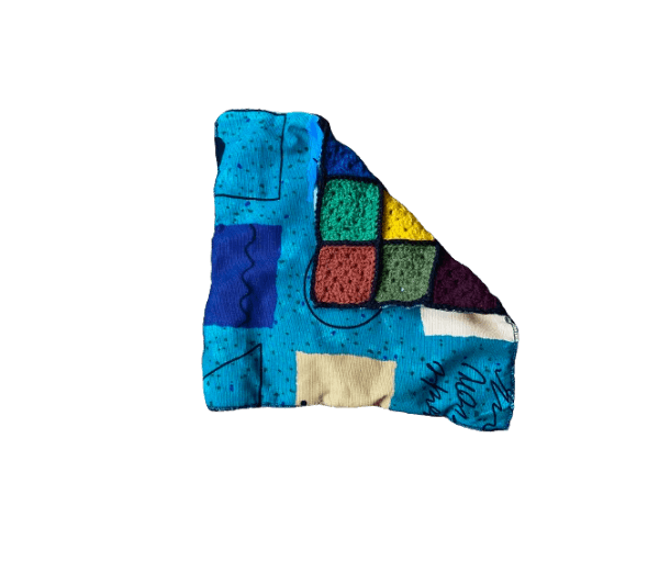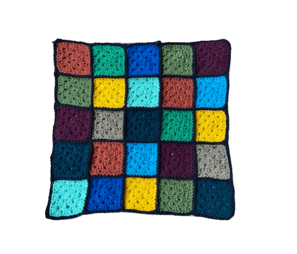 De ene kant gehaakt patchwork in verschillende warme kleurtjes met een zwarte buitenrand en zwarte binnenranden; de andere kant is van katoenen stof.
