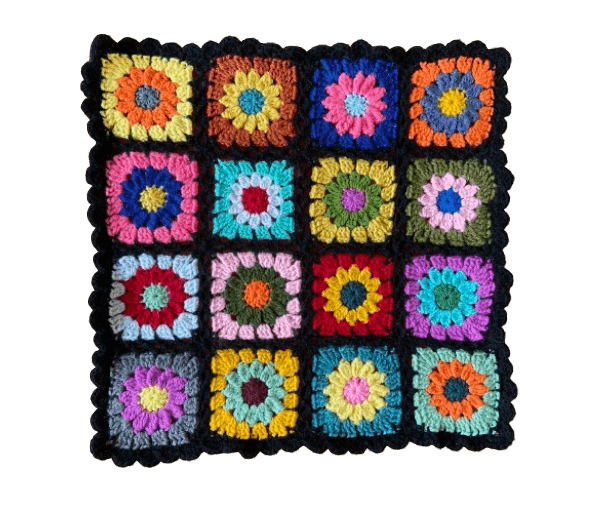 .Kleedje/kussenhoes gehaakte bloemen gekleurd met zwarte randen