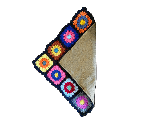 De ene kant gehaakt bloemenpatchwork in verschillende kleurtjes met een zwart geschulpte buitenrand en zwarte sierbinnenranden; de andere kant is van glanzende goudkleurige stof.