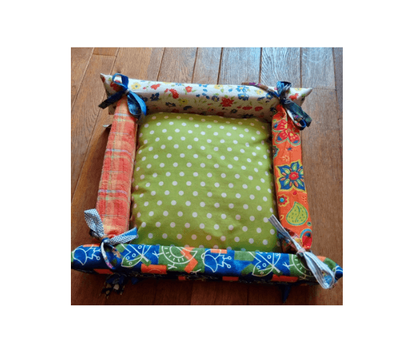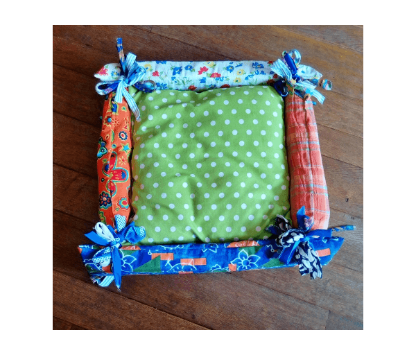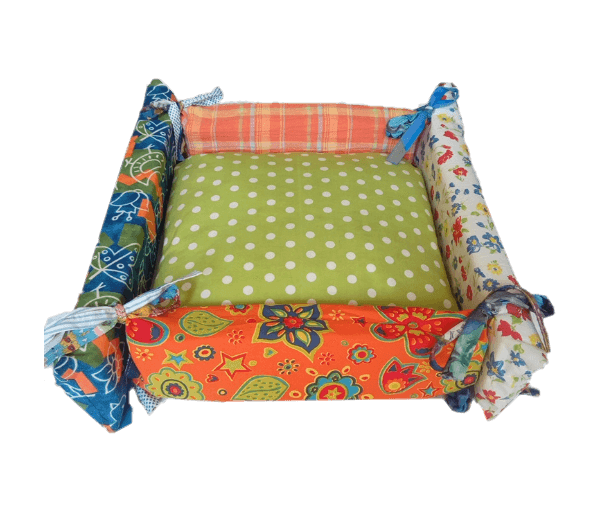 Bijzondere en leuke vrolijke vierkante mand voor kat of klein hondje bestaande uit een kussen (groen met witte stippen) waarbij de buitenranden gestrikt zijn. Het heeft dus 4 losse randen (gevuld met foam en met allemaal een ander leuk gekleurd stofje waarbij overal de tint groen terugkomt)