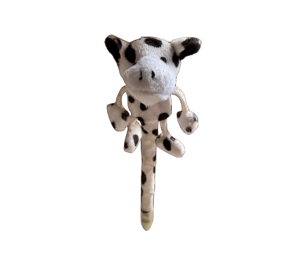 Leuke zwartschrijvende pen met er bovenop een pluche koetje met bungelpootjes. Afmetingen: 17x6x4cm.