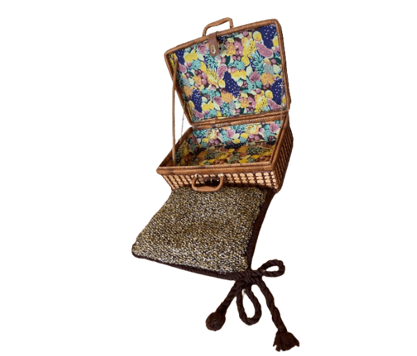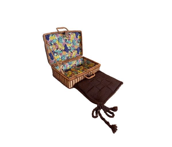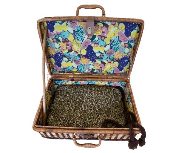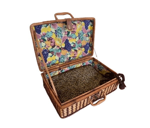 Leuk rieten koffertje, gevoerd met stof met afbeeldingen van fruit.