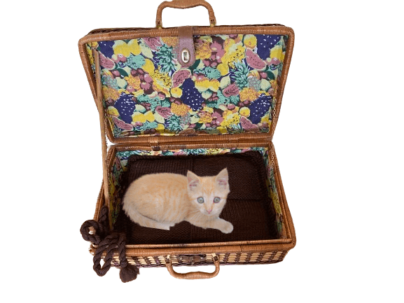 In het koffertje ligt een comfortabel stevig kussentje – de ene kant van gemeleerd breiwerk, de andere kant donkerbruin breiwerk, omgeven door een dikke bruine rand die sluit met een leuke strik, waarmee katjes bijv. nog kunnen spelen.