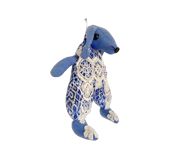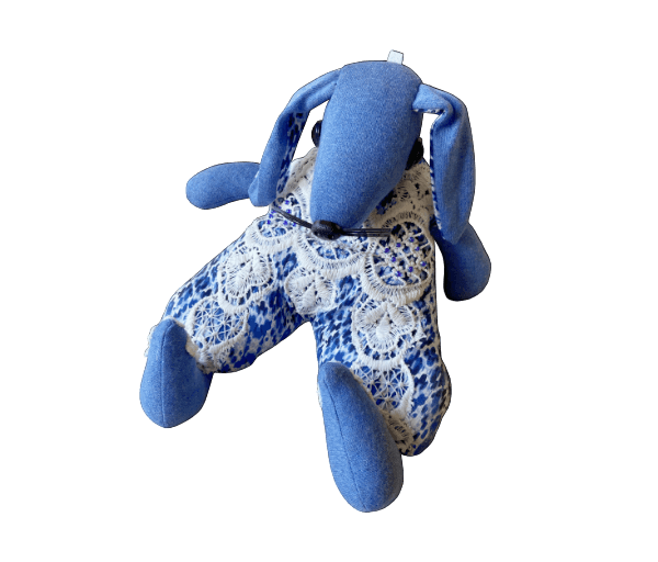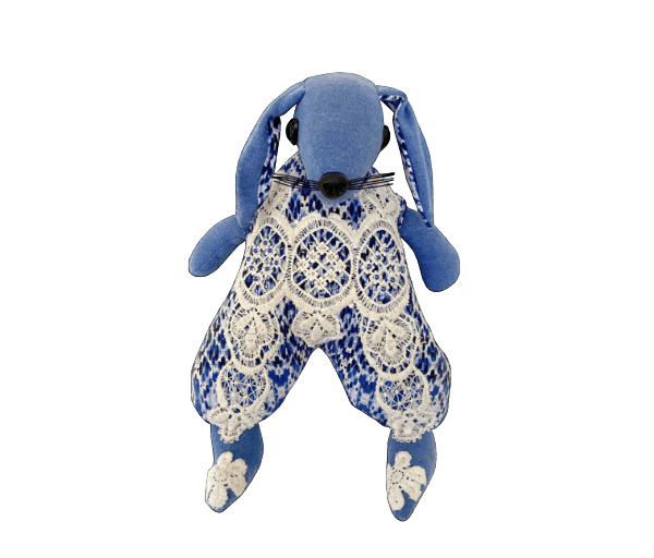 Mooi blauw konijn met wit kanten pakje aan.