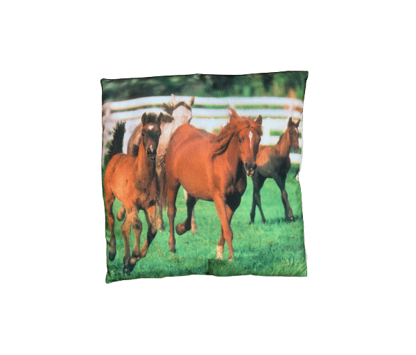 Mooi kussen (zonder opening/rits) met diverse paarden erop afgebeeld (dubbelzijdig).