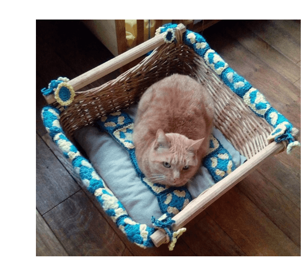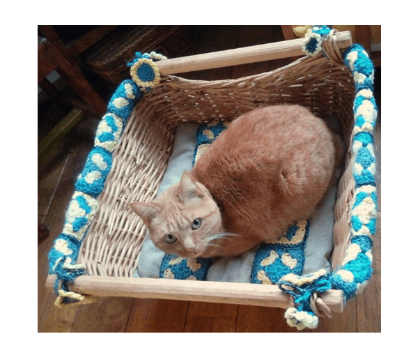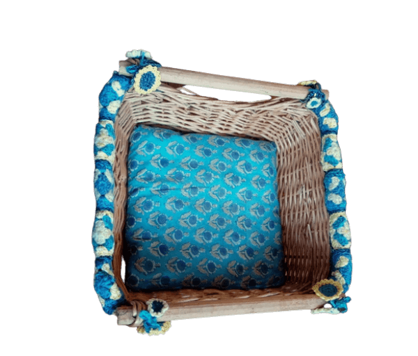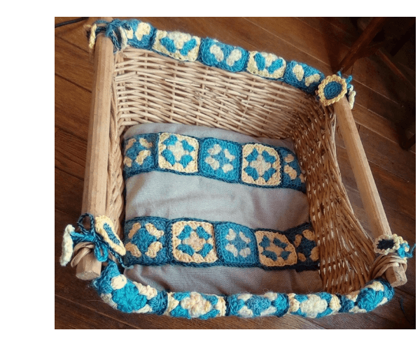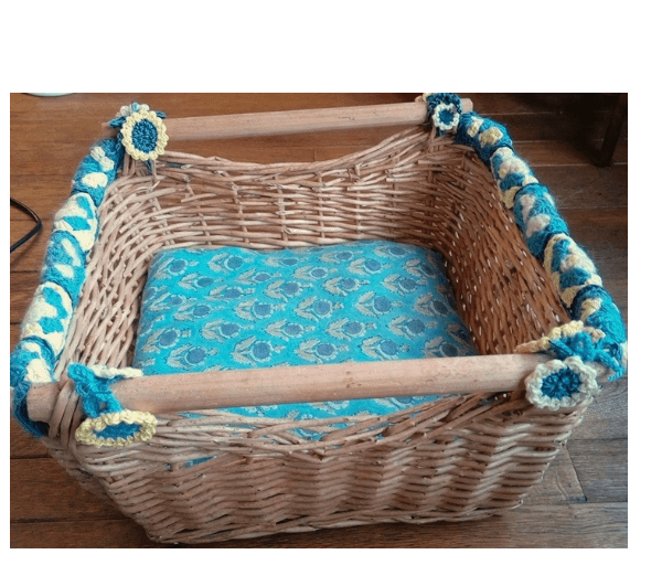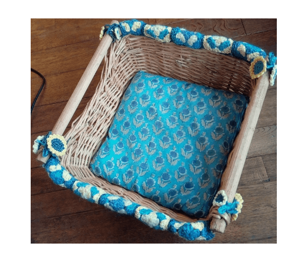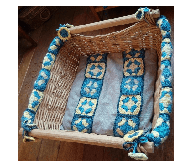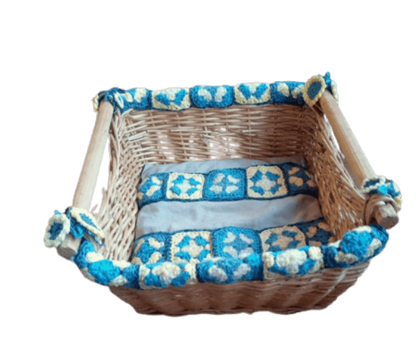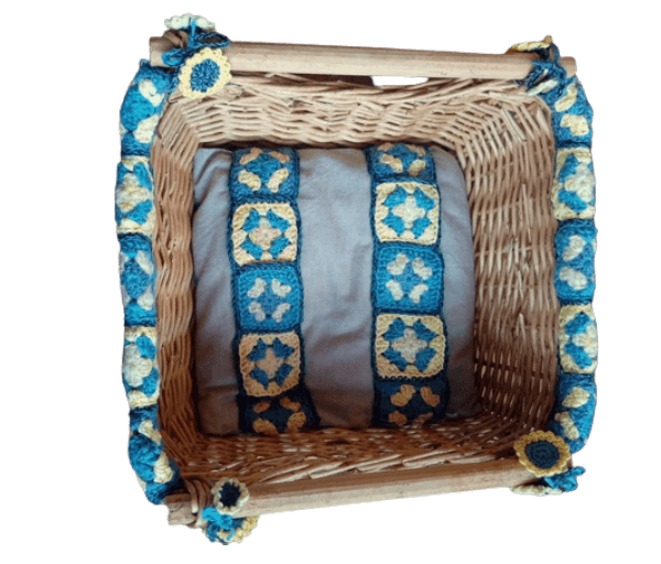 Wat blijven ze leuk: de rieten manden. Deze is vierkant met 2 houten handvaten. Twee rieten buitenranden zijn versierd met haakwerkjes. Deze haakwerkjes komen ook terug in de vierkante kussenhoes. De andere kant van het kussen heeft stof met bloemmotieven in dezelfde kleuren: blauw-groen/grijs/geel tinten. Tevens zijn er nog gehaakte sierbloemetjes bevestigd aan de handvaten in dezelfde kleurtjes.