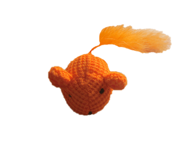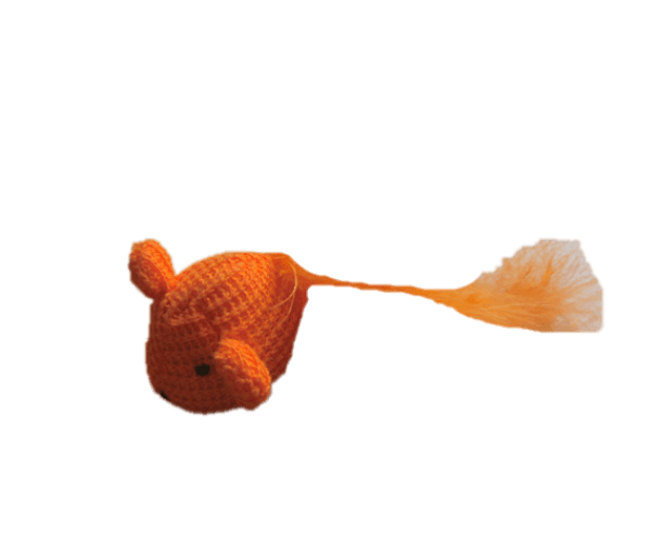 Leuke, gebreide oranje speelgoedmuis met een oranje veren staart.