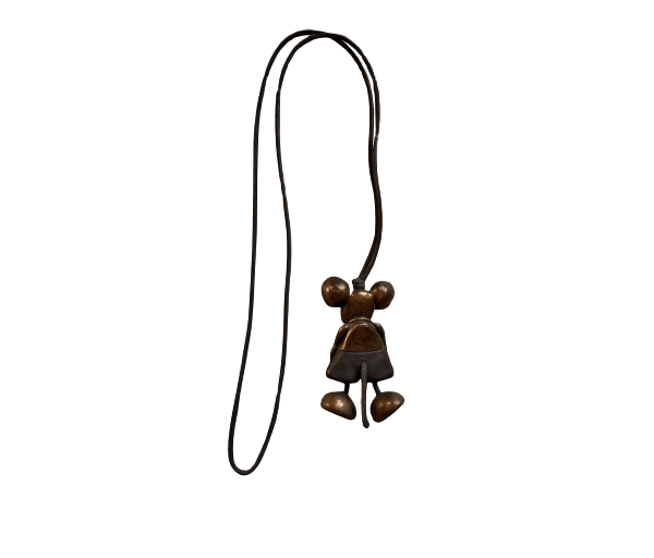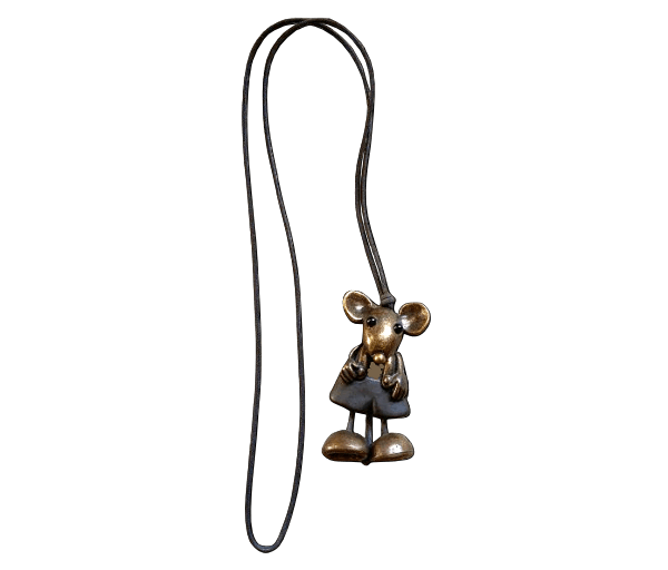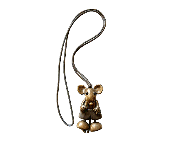 Superleuke hanger aan lang donkerbruin koord in de vorm van een bronskleurige muis met bewegende pootjes en staartje.