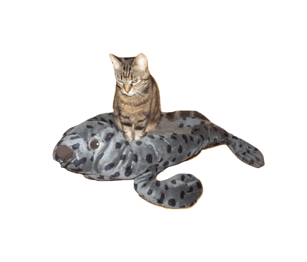 Leuk “mandje” in de vorm van een pluche grijze zeehond met donkere stippen.
