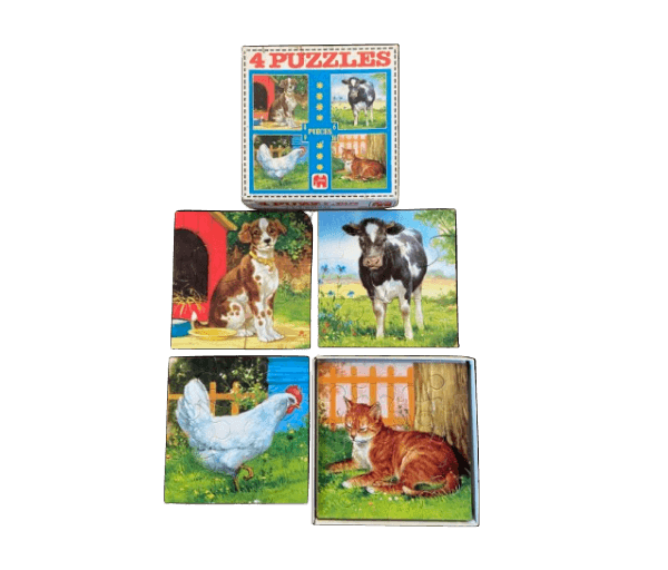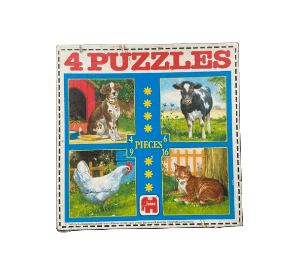 Superleuke 4 delige vintage Jumbo-puzzel met 4 (hond), 6 (koe), 9 (kip) en 16 (kat) stukjes.