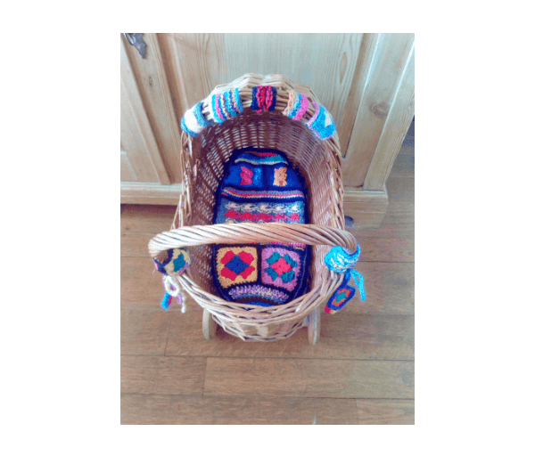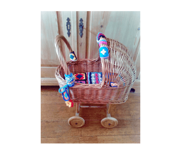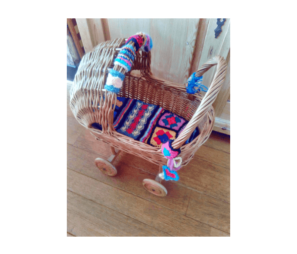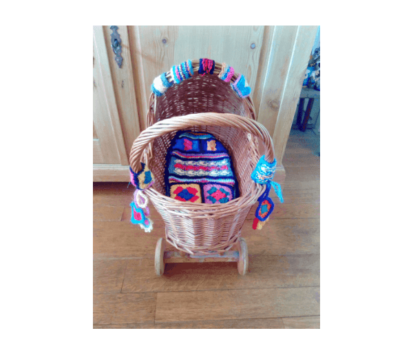 Met superleuk gehaakt/gebreid kussentje van vrolijke kleurtjes en allerlei haak- en breisteken. Met bijpassende versiering aan de rand van de kap en de zijkanten van het duwstangetje.