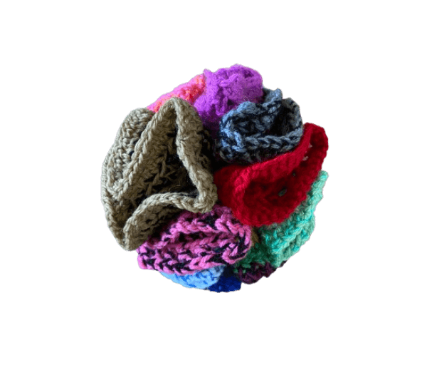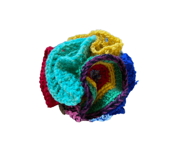 Dit exemplaar is gemaakt van gehaakte onderdelen (14 stuks) in allerlei kleurtjes – dus supervrolijk!