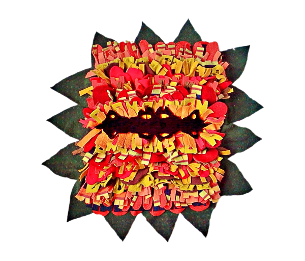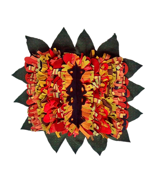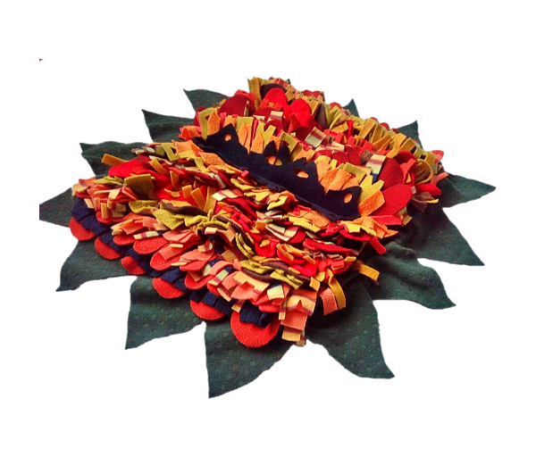 Supermooie en hele volle en grote fleece snuffelmat in de vorm van een grote bloem omgeven met groene bladeren in diverse herfstkleur-schakeringen (oranje, bruin, groen, geel, rood).