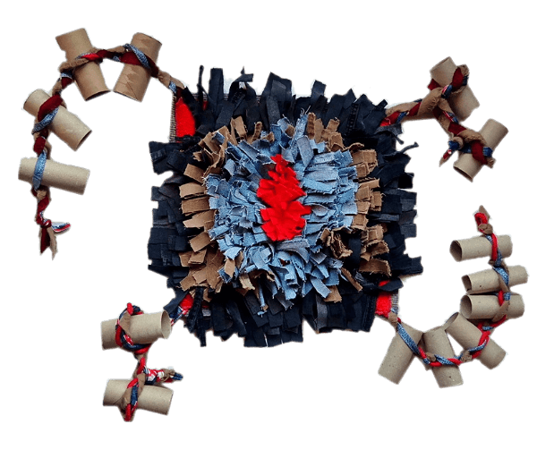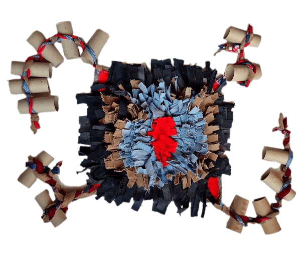 Leuke stoere volle snuffelmat spijkerstof gecombineerd met ribstof in de kleuren beige en grijs met een subtiel accent van rood in het midden. Tevens zijn er aan de buitenkanten nog vlechtwerken aangebracht waarin lapjes of rolletjes aangebracht kunnen worden voor extra snuffelplezier en -uitdaging.