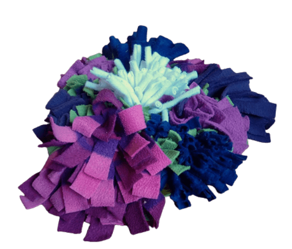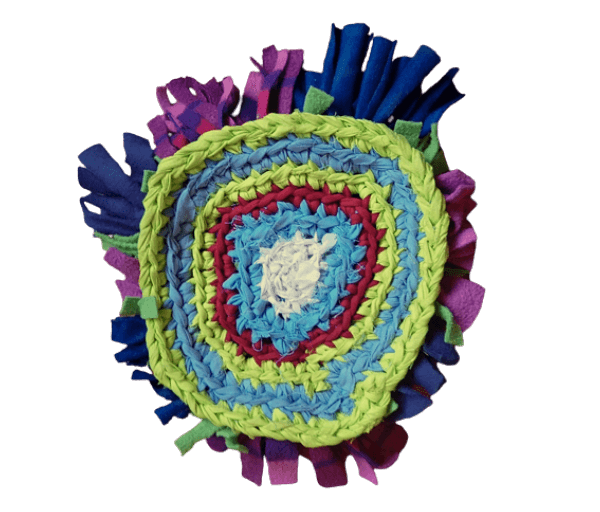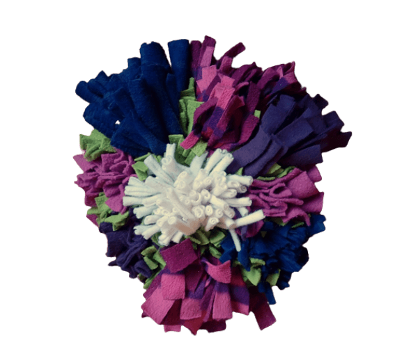 Leuk mooi heel vol snuffelmatje met fleecerepen in de kleuren paars, roze, blauw, groen en een wit hart. Maat S/M