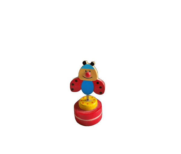 Leuke lieveheersbeestjesstempel (de stempel geeft een rood lieveheersbeestje te zien) in een rond doosje met een houten lieveheersbeestje aan een spiraaltje er bovenop.