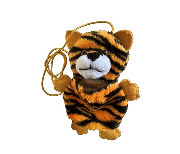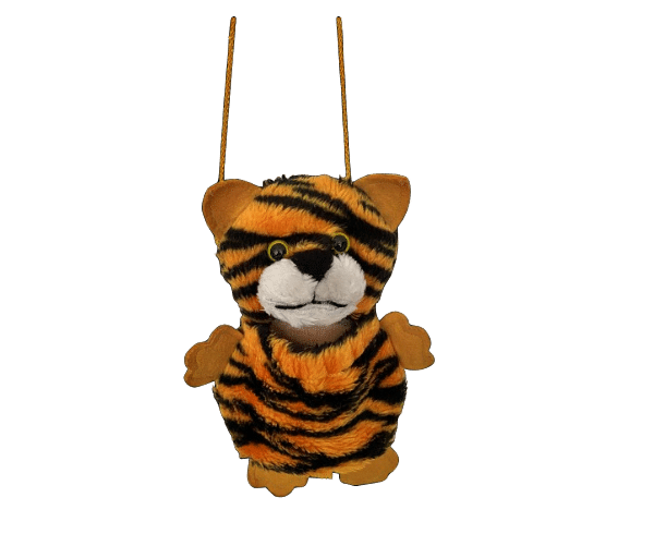 Leuk buideltasje aan een okerkleurig koord in de vorm van een lieve tijger. Afmetingen: 22x17x7 cm