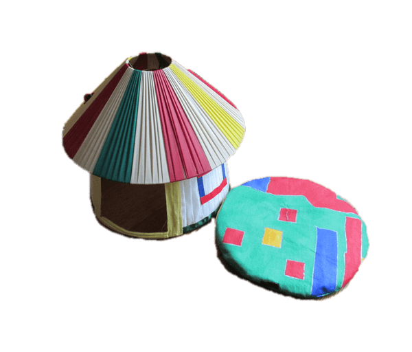 met stoffen raampjes in de basic kleuren rood, geel, groen blauw en wit met een bijpassend rond kussentje in dezelfde kleurtinten.